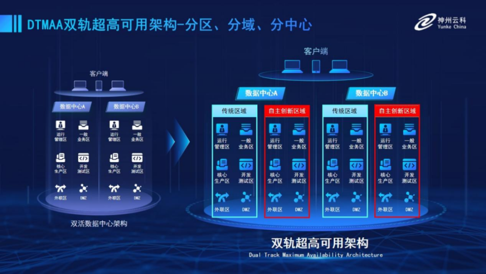 为帮助金融客户更好地应对数字经济时代对可持续性的高要求,实现“信创”与“数字化”齐头并进,bifa必发官网推出了双轨超高可用架构。该架构在双活数据中心的分区调度基础上,增加信创域和非信创域的分域调度,实行信创域与传统域应用全量部署,使双中心运营变为双中心四区域并行运行,互为多活,将“0到1”的单轨建设道路变为分区分域协同的多活双轨超高可用架构。帮助客户在新架构下,保障“信创”的同时解决性能瓶颈,提升稳定性,保证应用可持续性,最终实现信创区域和非信创区域的平滑过渡,完成国产化替代目标。